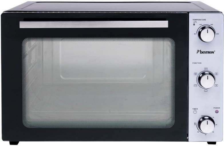 De Bestron Grill-Bakoven AOV45 met een inhoud van ca. 45 Liter heeft een 6-standenschakelaar, een 60 Minuten timer en een instelbare temperatuur tot 230°C.