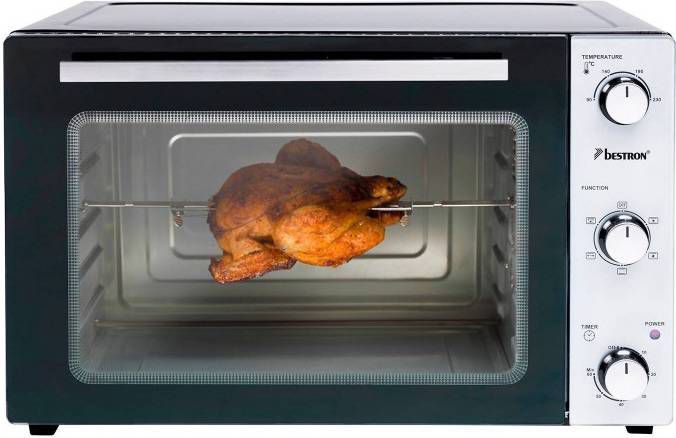 De AOV45 grilloven van Bestron heeft een vermogen van 1.800 W en een instelbare temperatuur tot 230 °C en heteluchtcirculatie. Hij is een betrouwbare elektrische oven, een praktische rotisserie voor vlees en gevogelte, maar is ook ideaal voor het snel roosteren, bakken en grillen van heerlijke gerechten! De rotisserie-functie is handig als je thuis heerlijk knapperige kip wilt bereiden. Deze Bestron convectieoven heeft 4 verschillende roosterhoogtes en werkt op basis van 4 verwarmingselementen die een gelijke hoeveelheid boven- en onderwarmte afgeven. De hittebestendige behuizing is uitgerust met een roestvrijstalen bedieningspaneel en een draaiknop voor het selecteren van boven- of onderwarmte. De 60-minuten timer met alarm is erg handig wanneer je door andere taken in de keuken wordt afgeleid. De dubbelwandige glazen ovendeur heeft een hittebestendige handgreep zodat je veilig kunt werken. De Bestron oven is heel eenvoudig te reinigen en is uitgerust met een indicatielampje en een automatische schakel-uit functie. De levering bevat 1 grillrooster, 1 geëmailleerde bakplaat en 1 eenvoudig afneembaar handvat.